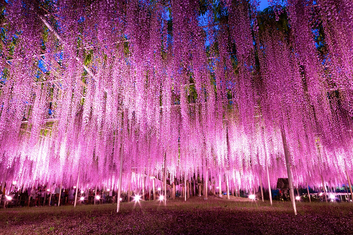 Điểm nhấn của lễ hội là Cây tử đằng cổ thụ 150 năm tuổi (Ofuji), đường hầm hoa trắng/vàng và màn trình diễn ánh sáng ling linh về đêm